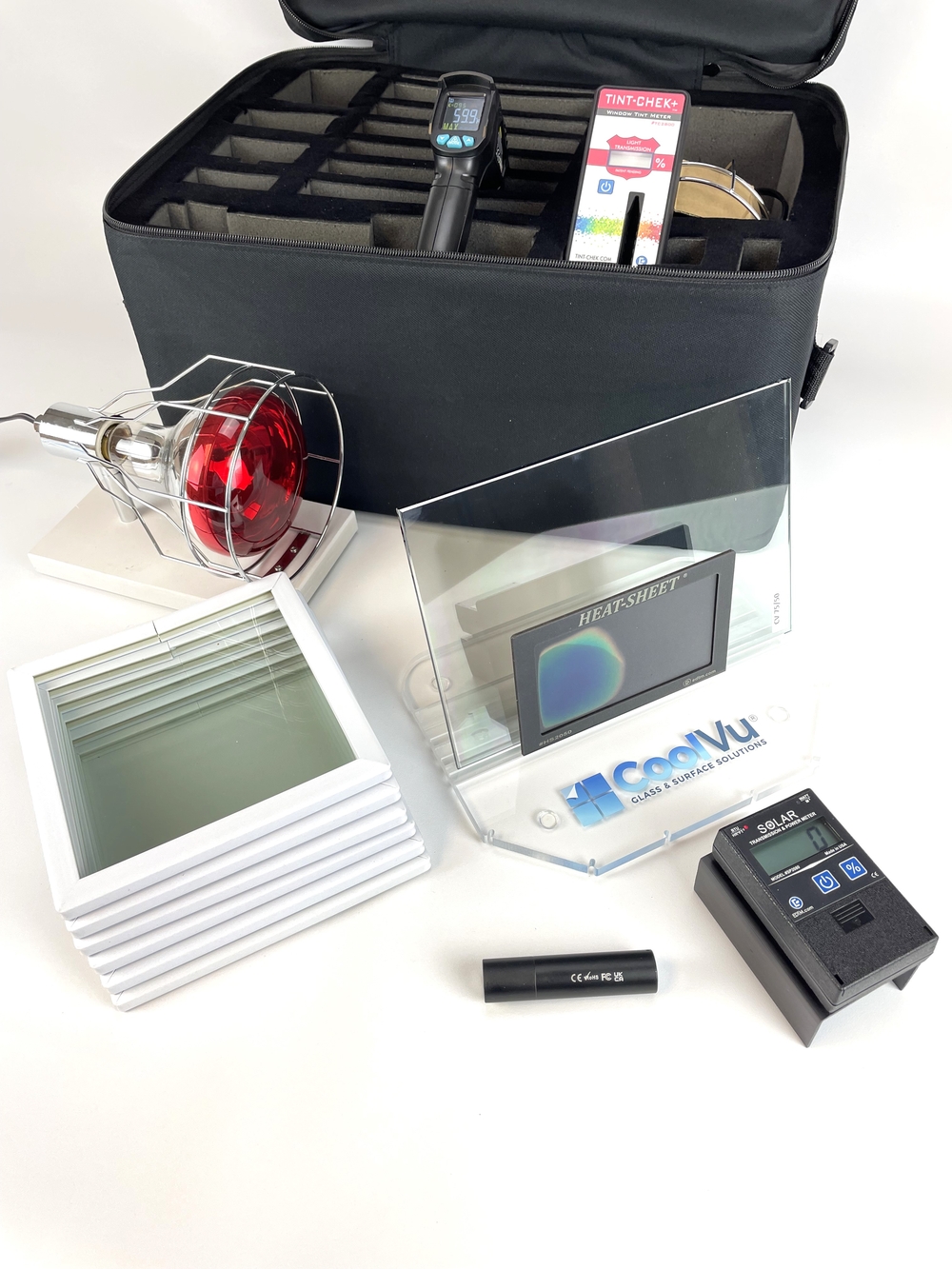 The CV1985 has been customized exclusively for CoolVu franchise partners and offers several accessories to elevate your sales presentation. The tools in this sales kit have been selected to provide a compelling demonstration of your film's ability to block unwanted solar rays. This combination of tools allows you to measure the film's performance as well as demonstrate it visually. Apply your most popular films to the glass set for a dynamic presentation, or even show lesser-performing competing products.